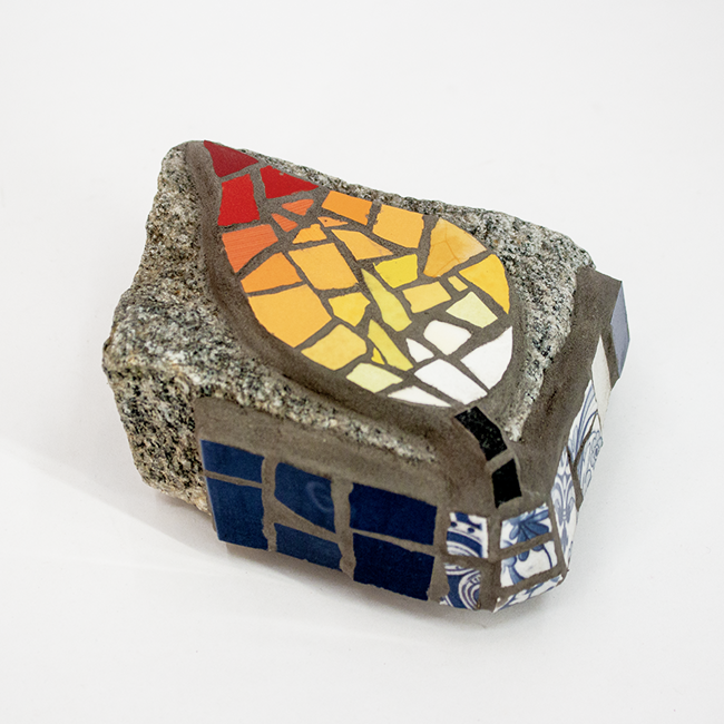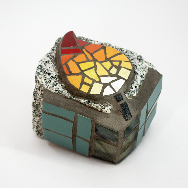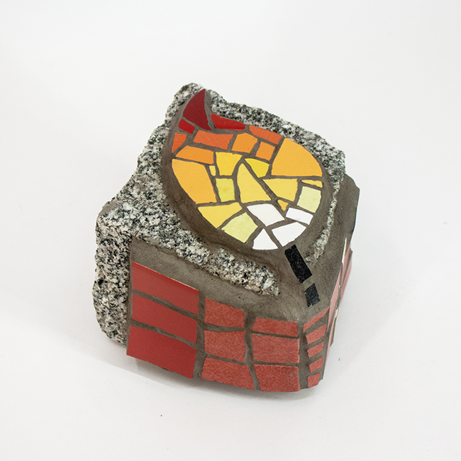 Granitna kocka, oblečena v ročno izdelan mozaik iz keramike v obliki sveče. Naraven in trajen izdelek, ki vedno “gori”, kot spomin, ki nikoli ne ugasne.