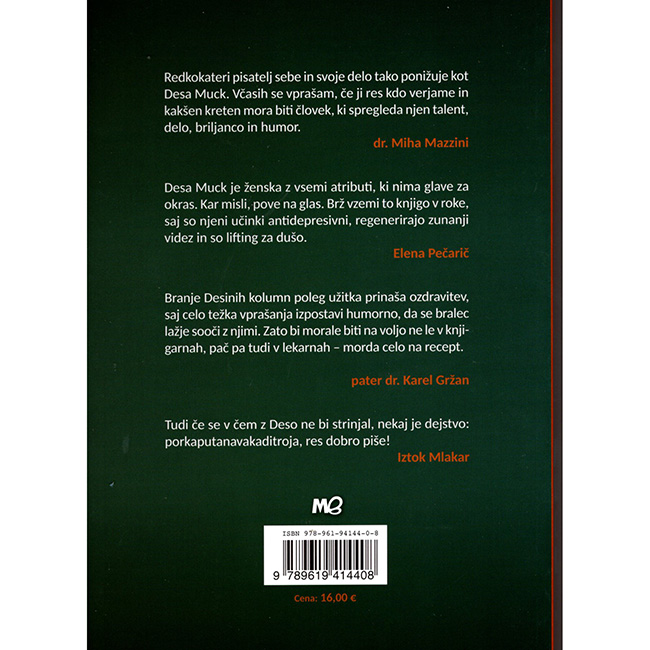 kar imam rad pri ljudeh in po čemer zaznam inteligentnega človeka, je samoironija. Kdor se ne norčuje iz svojih napak, prepušča ta posel drugim – in ti si v tem poslu temeljita in dosledna. Vsak dober humor skriva v sebi solzo, vsaj spomin nanjo, in včasih imam moralnega mačka, ko se ti smejim. Ja, tvoj smeh je vedno žalosten in tvoja žalost, oprosti, včasih smešna. Sicer pa tako dobro zapisuješ besede, da se jih sliši. Z lahkoto in užitkom se te bere, prebrati pa te je po moje nemogoče. Tudi če se v čem s tabo ne bi strinjal, nekaj je dejstvo: porkaputanavakaditroja, res dobro pišeš!